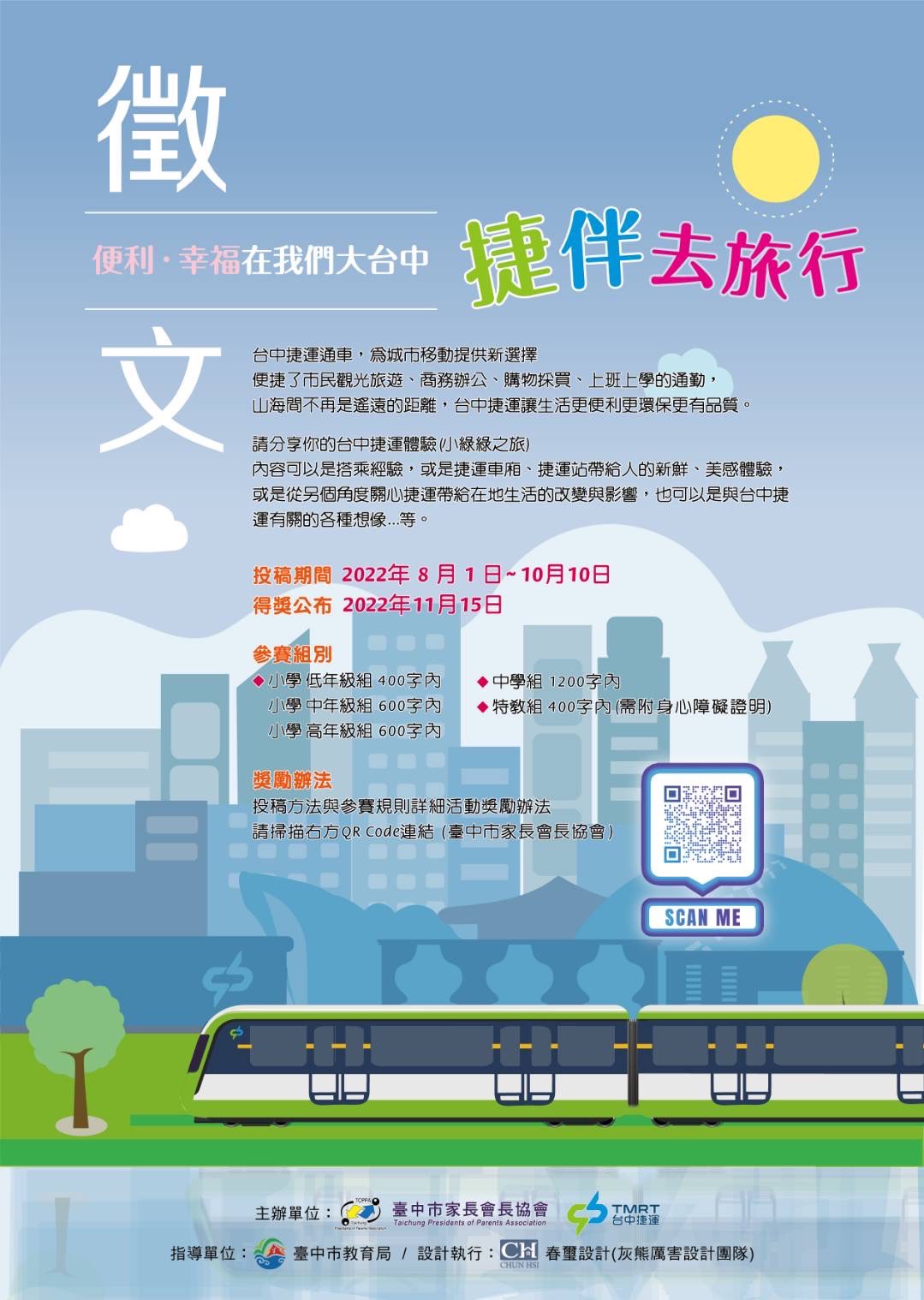 一、依據臺中市家長會長協會111年8月30日中長協會菁字第1110830018號函辦理。 二、臺中市家長會長協會為提升學生語文寫作能力,並了解大臺中的重大系統設施,提升臺中市捷運能見度,爰與臺中市捷運股份有限公司共同辦理「便利.幸福在我們大台中」徵文比賽,參加對象為本市國小及國中學生。 三、旨揭徵文比賽投稿日期自即日起至2022年10月10日止。 四、徵文活動辦法,詳見附件海報。 五、本案相關疑問請逕洽臺中市家長會長協會林先生,電話:0985-610047。 |