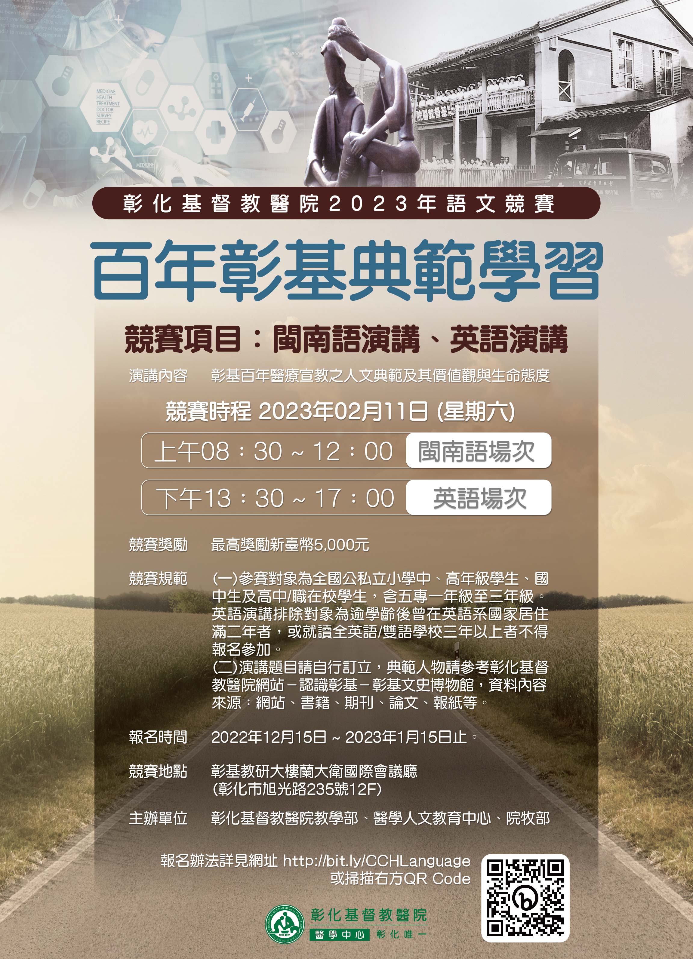 一、依據彰化基督教醫療財團法人彰化基督教醫院111年12月2日一一一彰基院穆字第1111100080號函辦理。 二、相關資訊如下: (一)比賽項目:閩南語、英語演講,依活動主題及報名組別自訂題目及演講稿。 (二)報名時間:2022年12月15日起至2023年1月15日止。 (三)報名網址:http://bit.ly/CCHLanguage。 (四) 比賽日期:2023年2月11日(上午:閩南語、下午:英語)。 三、檢附來文、比賽實施計畫及活動DM各1份。 四、本案如有疑義請逕洽林生先,電話:04-7238595轉4368 。 |