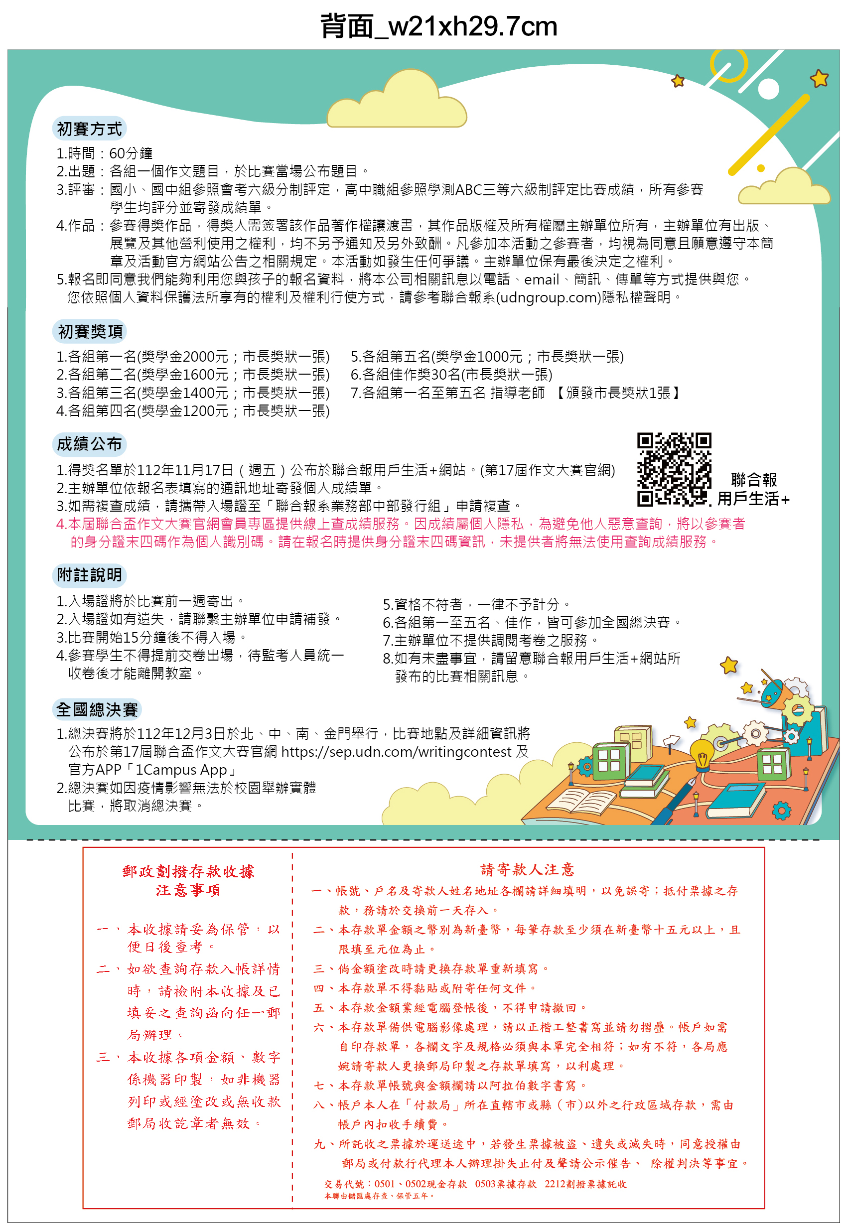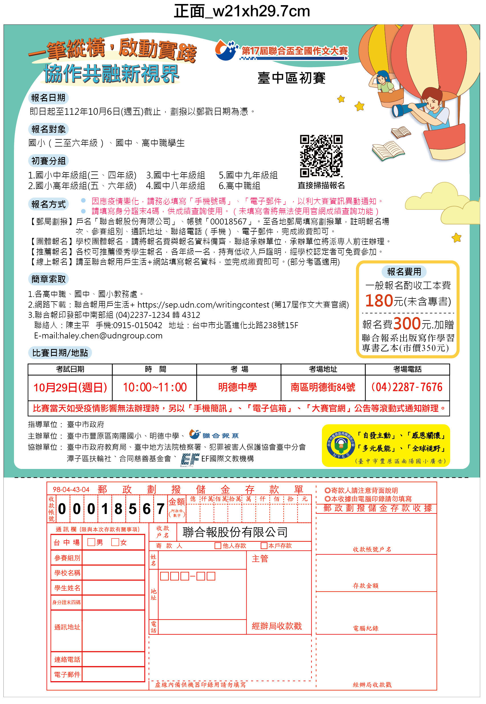 一、依據聯合報業務部中部業務組112年9月5日聯作中字112000905號函辦理。 二、參加對象:國小3-6年級、國中7-9年級及高中1-3年級學生。 (一)各校依參賽年級各可推薦1名代表學校免費參賽。 (二)學校針對低收入戶學生可額外推薦參賽,不受各年級指定推薦人數所限制。 三、報名日期:即日起至112年10月6日(星期五)止。 四、檢附海報、簡章及團體報名表各1份供參。 六、本案酌收工本費,請本權責卓處。 七、相關疑問請逕洽王先生,聯絡電話:2237-1234轉4314。 |