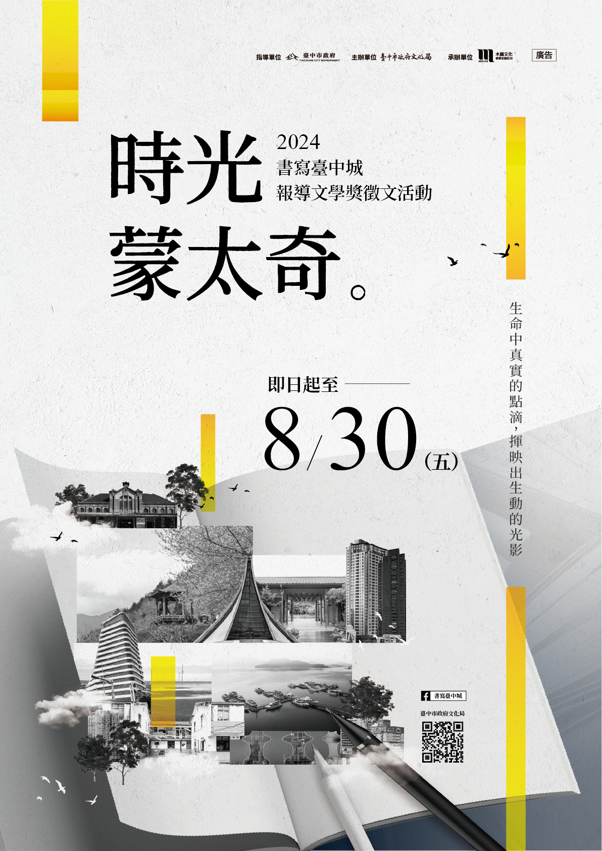 一、依據臺中市政府文化局113年5月10日中市文研字第1130009993號函辦理。 二、徵件日期自即日起至113年8月30日止,採紙本或線上擇一報名投稿,詳情請見簡章,亦可查詢文化局網站(https://www.culture.taichung.gov.tw/)或活動臉書專頁(https://lurl.cc/qRZrKQ)。 三、檢附來函、活動簡章、海報各1份。 四、關於活動任何問題,請洽詢專線及信箱02-25431636分機15;mulanrenew018@gmail.com。 |