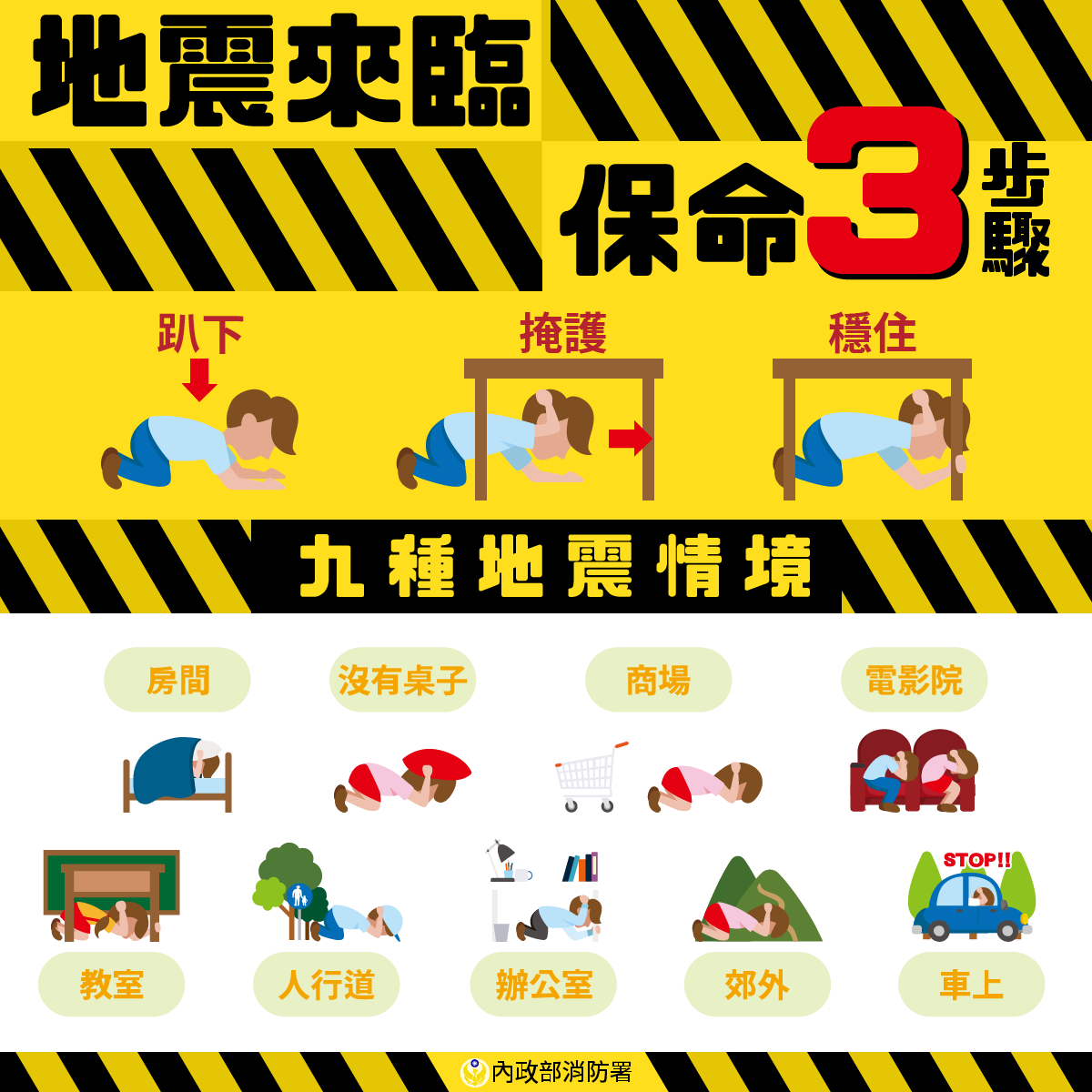 地震防災 在公共場所時,千萬不能慌張喔! 1.當你在看電影時 (1)在電影院看電影時發生地震,請直接俯身躲進前後排座椅中間的走道。 若空間不夠則彎腰、抱頭,盡量俯身到比椅背低。 (2)若行進在走道旁發生地震,可以找堅固的牆柱蹲下暫避。 2.當你在辦公室時 (1)躲到自己辦公桌下,趴下、掩護、穩住,保護自身頭頸部。 (2)別往上看 利用桌子來保護頭、頸部和身體,以免被掉落的電燈、電扇或天花板等物品砸傷。 因為日光燈可能會破掉,這個時候如果往上看,很容易被破片刺傷。 3.當你在電梯旁邊時 若行進在電梯旁邊,可以在電梯外牆旁邊趴下、掩護、穩住,並拿起隨身物品保護自身頭頸部,但請絕對不要進入電梯內。 4.當你在補習班時 (1)躲到自己課桌下,趴下、掩護、穩住,保護自身頭頸部。 (2)按照補習班的人員指示進行疏散。 摘自內政部消防署全球資訊網-防災知識一起學網頁 |
