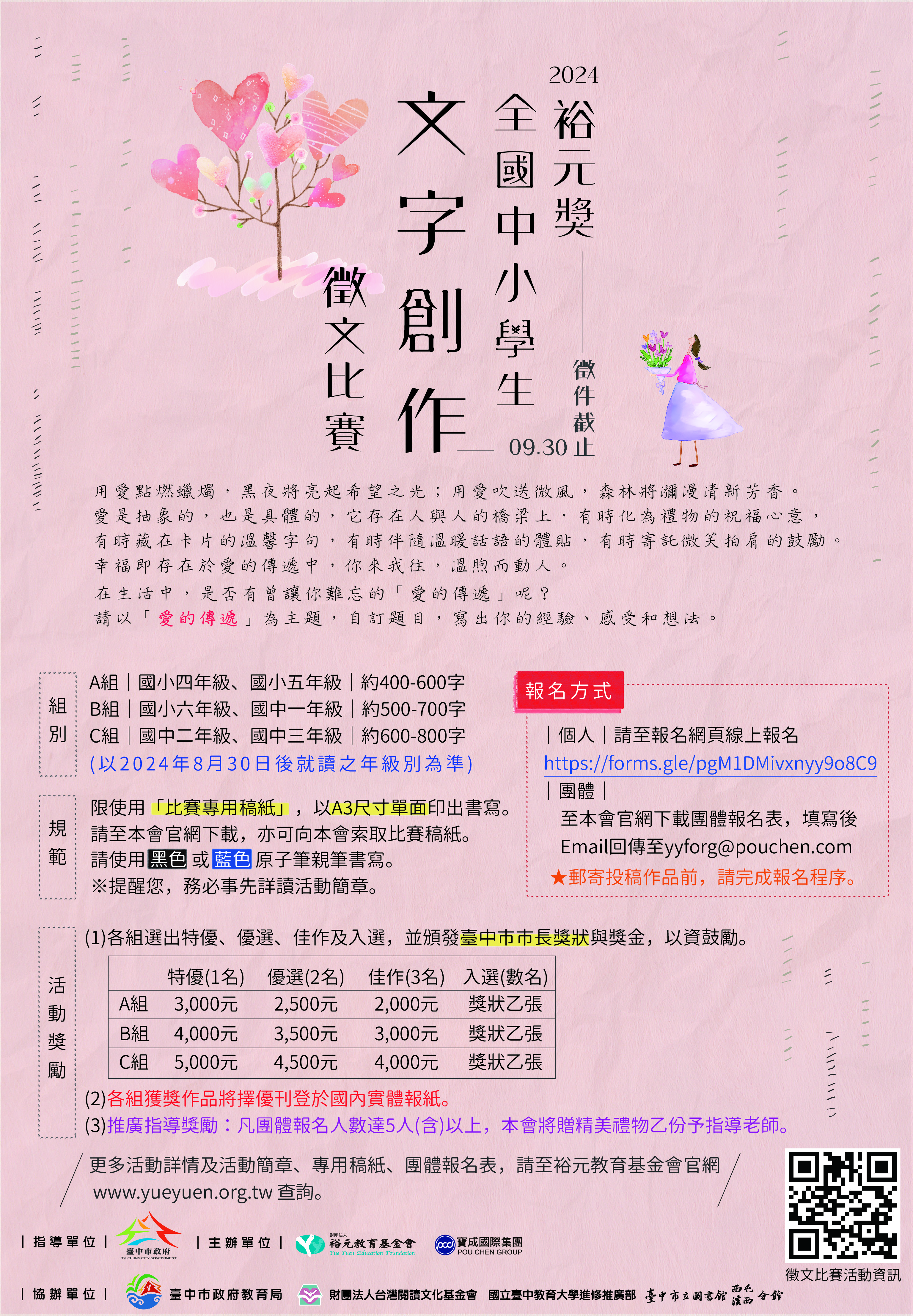 一、依據財團法人裕元教育基金會113年4月26日裕教基字第202401002號函辦理。 二、檢附活動簡章、團體報名表、比賽稿紙、摺頁簡章及海報各1份。 三、倘有相關問題,請逕洽該會承辦人:吳小姐,電話:04-24606690。 |