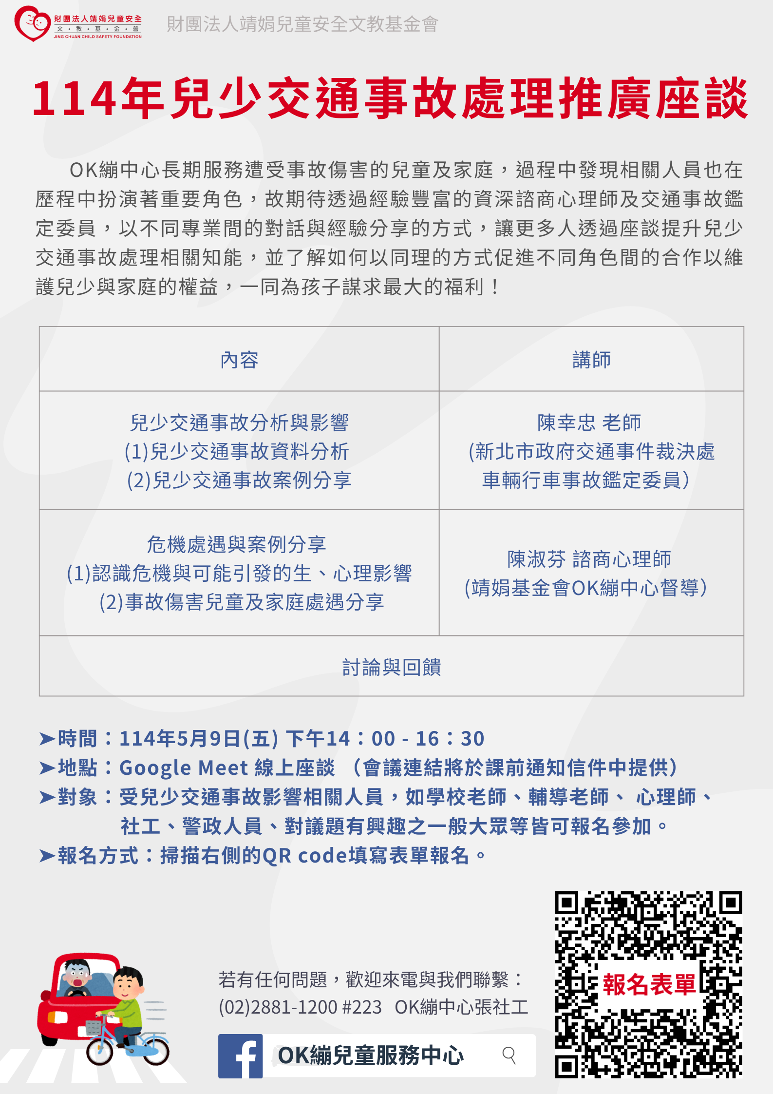 | 文件標題 | 轉知財團法人靖娟兒童安全文教基金會OK繃兒童服務中心於114年5月9日(星期五)辦理「114年兒少交通事故處理推廣座談」,請協助推廣轉知,並請踴躍派員參加,請查照。 |