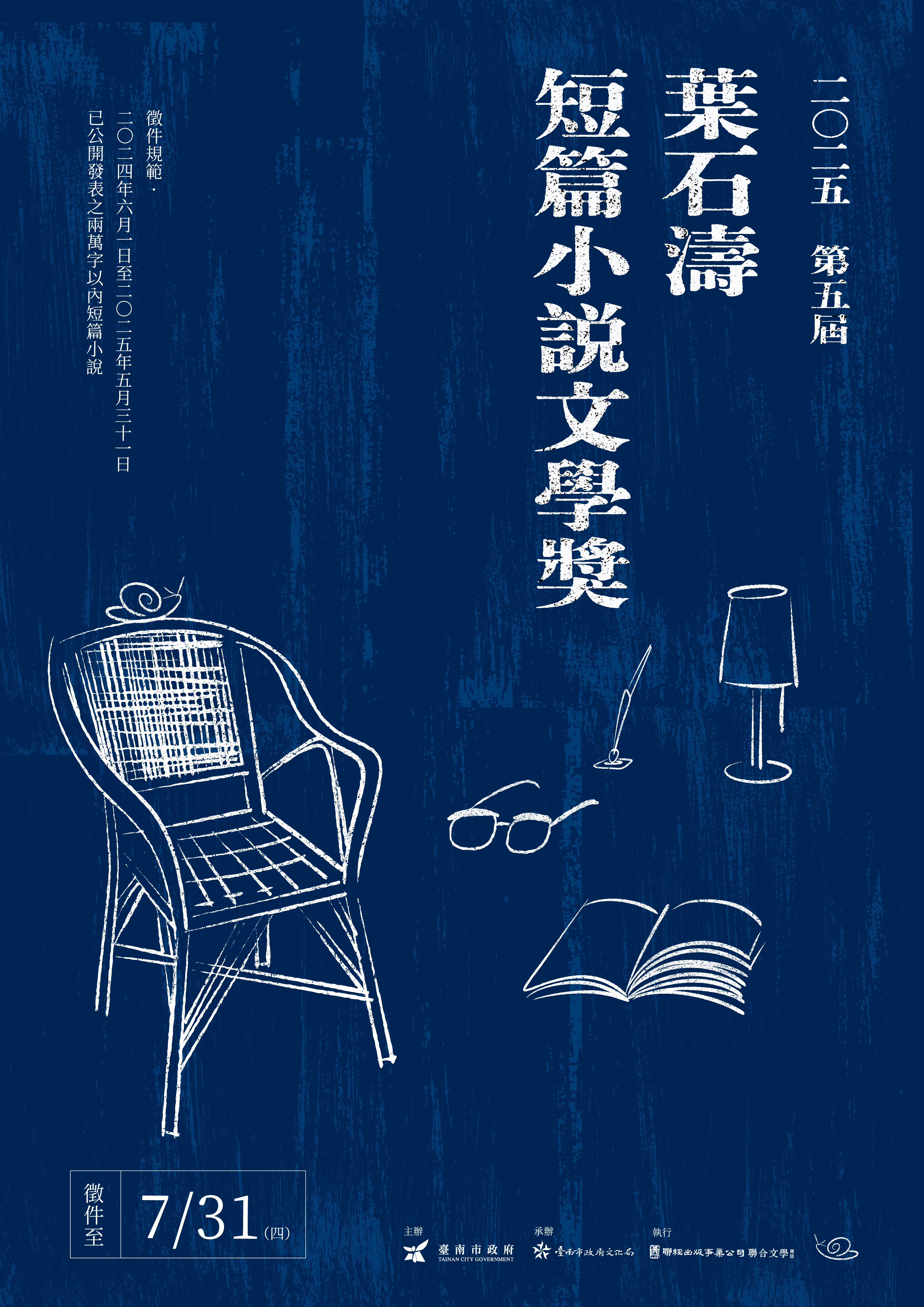 一、依據本府114年5月13日府授文研字第1140130910號函辦理。 二、旨揭徵文活動收件日期至114年7月31日截止,採紙本及線上投稿。 (一) 「第十五屆臺南文學獎」報名表請至臺南文學獎徵件官網:https://culture.tainan.gov.tw/theme/latestevent/index?Parser=9,41,240下載或點選。 (二) 「第五屆葉石濤短篇小說文學獎」報名表請至葉石濤文學紀念館官網:https://culture.tainan.gov.tw/theme/latestevent/index?Parser=9,47,302,292下載或點選。 三、檢附「2025 第五屆葉石濤短篇小說文學獎」及「第十五屆臺南文學獎」徵選簡章、海報各1份。 四、本案如有疑義逕洽承辦人許舒雅,電話:06-2991111#7903。 |